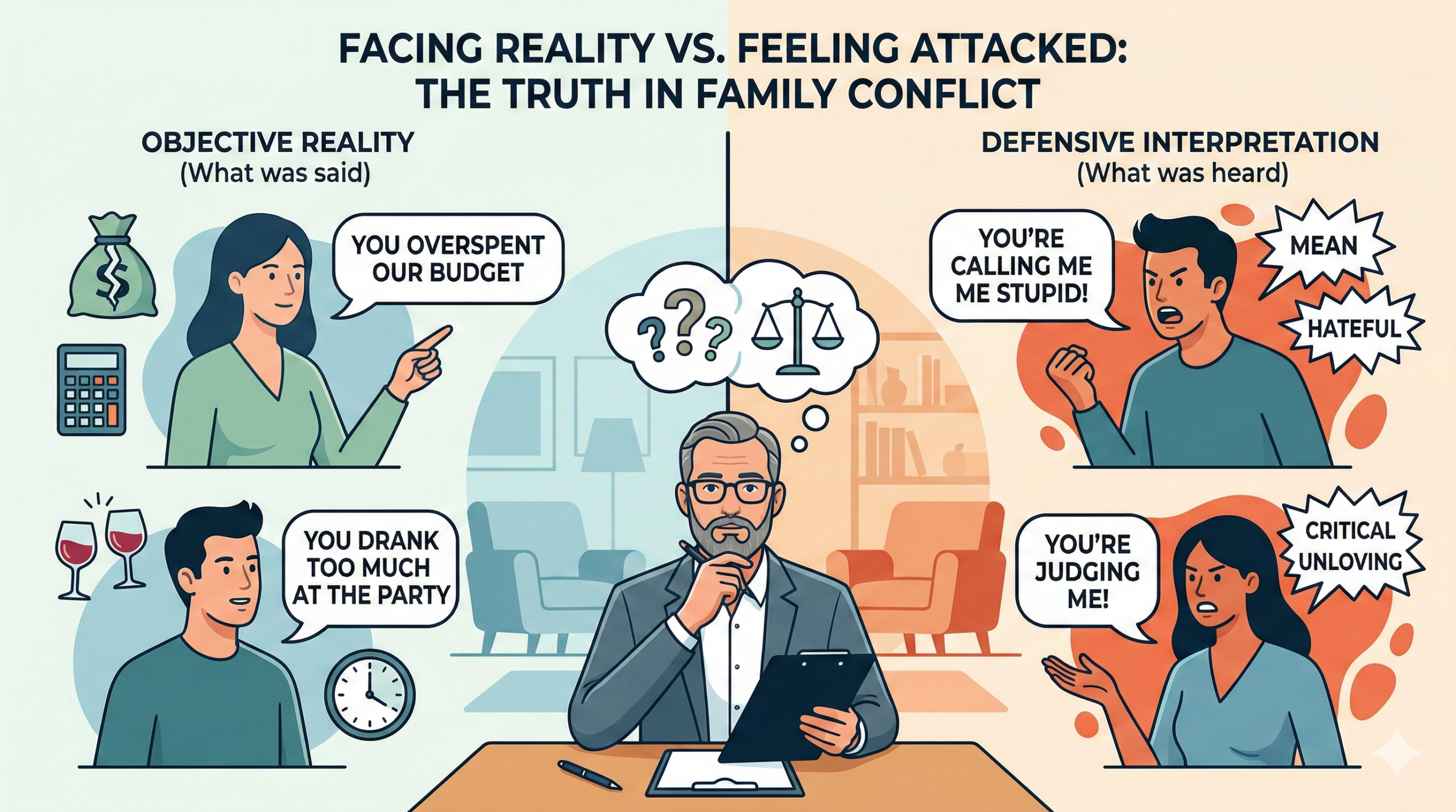 When this happens I usually draw a line down a piece of paper and have each side write down what they remember was said. On one side of the paper will be an objective statement. These statements might include something like you drank too much and yelled at me or you spent more money than you said you would. On the other side will be a subjective and usually judgemental one. These statements might include something like you said I am obnoxious or you said I am stupid and can’t do math. These statements refer to the same events but each party hears two different things.