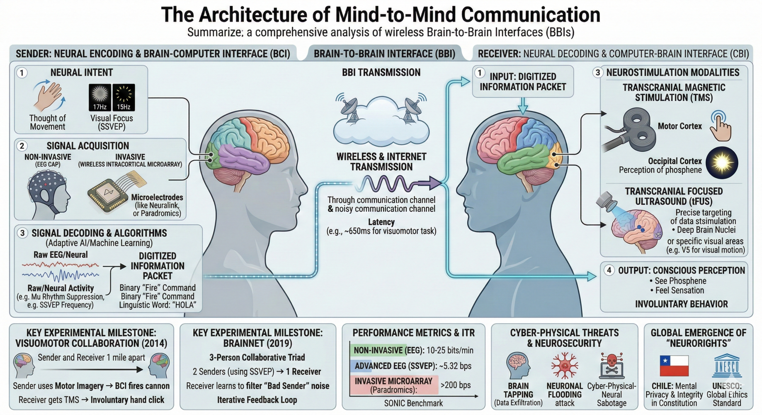 First, a brain-computer interface (BCI) reads electrical activity from a “sender’s” brain using EEG electrodes or, increasingly, implanted microarrays. Machine learning algorithms decode that activity into digital signals representing intentions, commands, or concepts.