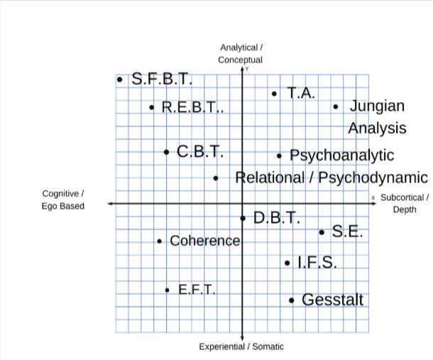 CBT – Cognitive Behavioral Therapy (Aaron Beck) REBT – Rational Emotive Behavior Therapy (Albert Ellis) TA – Transactional Analysis (Eric Berne) EFT – Emotion Focused Therapy (Sue Johnston) IFS – Internal Family Systems (Richard Schwartz) SE – Somatic Experiencing (Peter Levine) Gestalt – (Fritz Perls) Jungian Analysis – (Carl Jung) Psychodynamic / Psychoanalytic – (Sigmund Freud, Neo Freudians) |